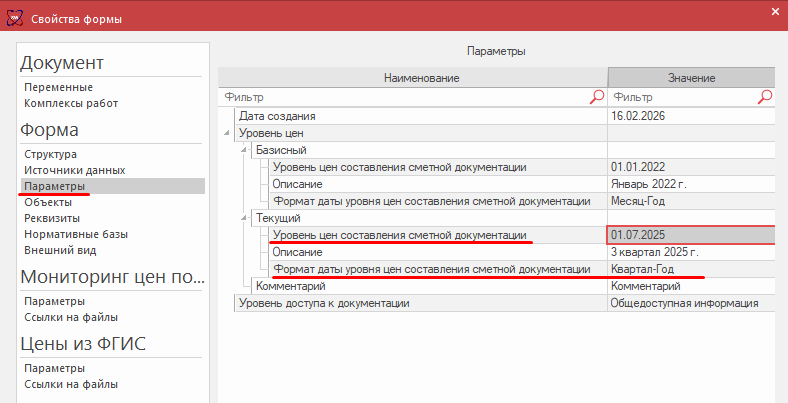 Уровень цен составления сметной документации. Изначально поле автоматически заполняется в формате «квартал – год». Значение берётся из текущего уровня цен, который был выбран при привязке сметно‑нормативных баз во время создания КА (через мастер создания КА).